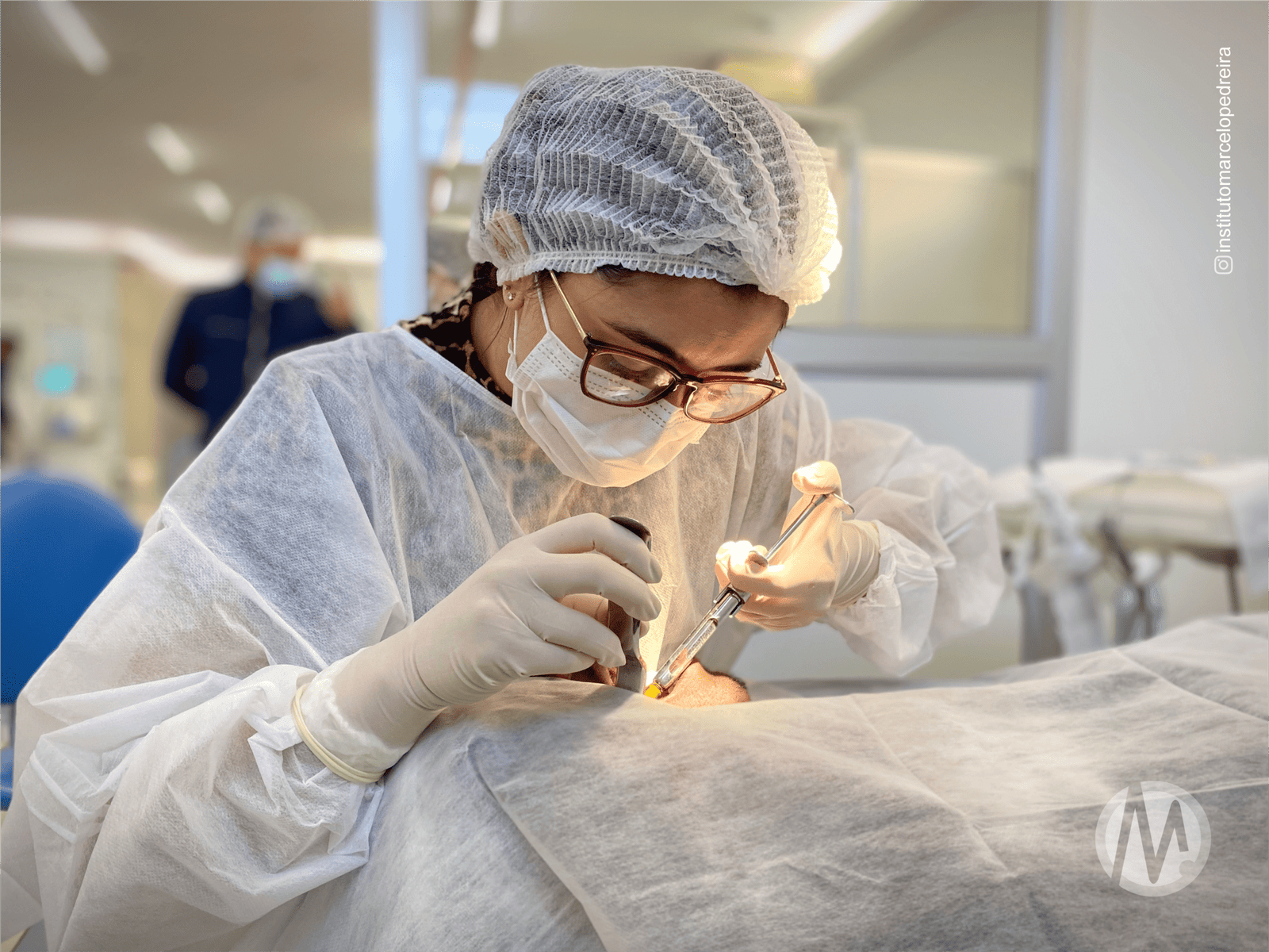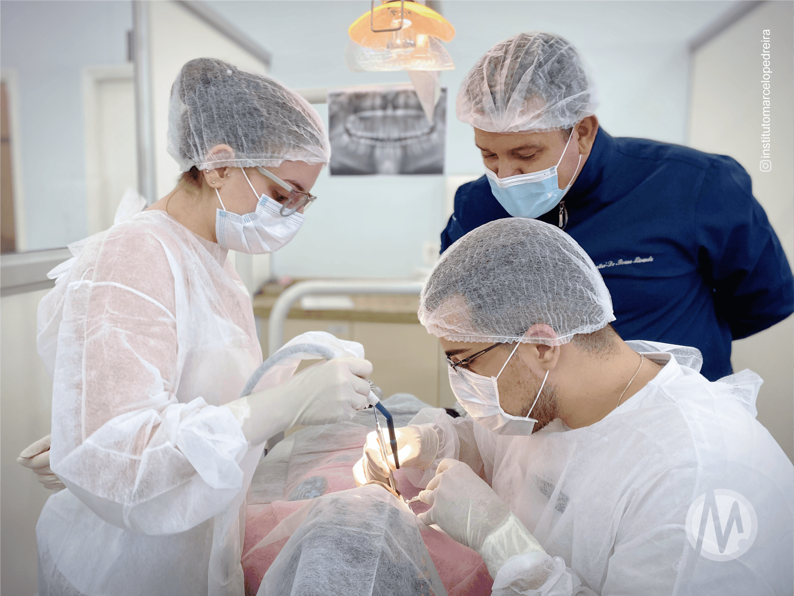 Acesso cirúrgico e colagem de botões para tracionamento;